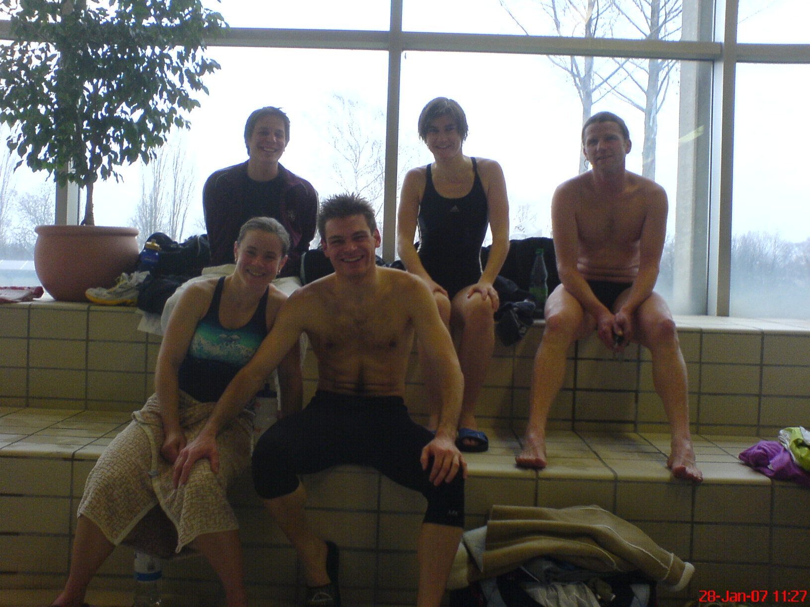 Nach dem Schwimmen. Dieses Mal ist das Lächeln echt. Alle waren zufrieden. Gleich wird gelaufen...