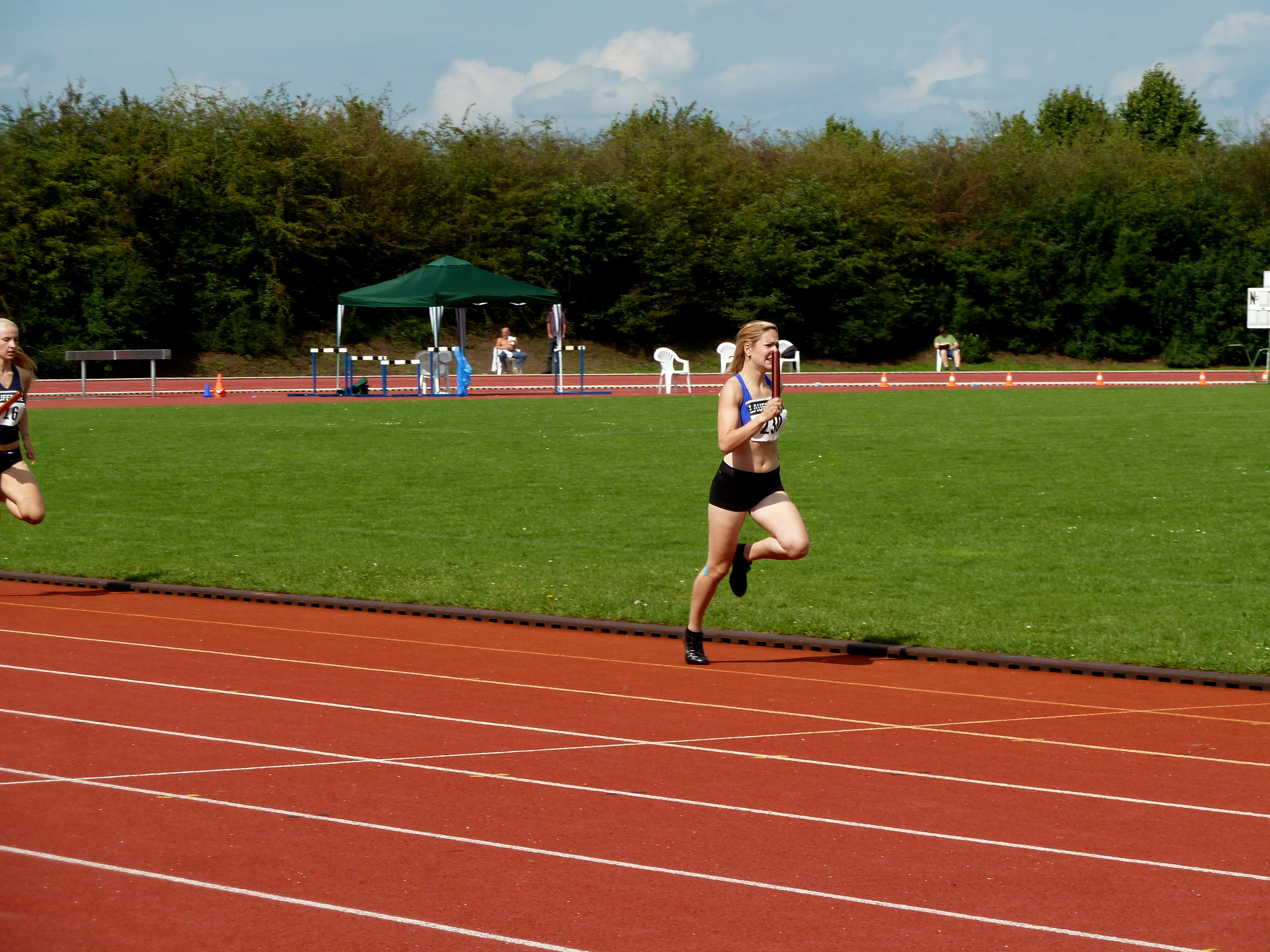 Eileen hat sich die vor ihr liegende Läuferin geschnappt und läuft die Staffel nach insgesamt 4:03,79 min ins Ziel - ein hervorragender 5. Platz war der Lohn für eine große Staffel-Leistung