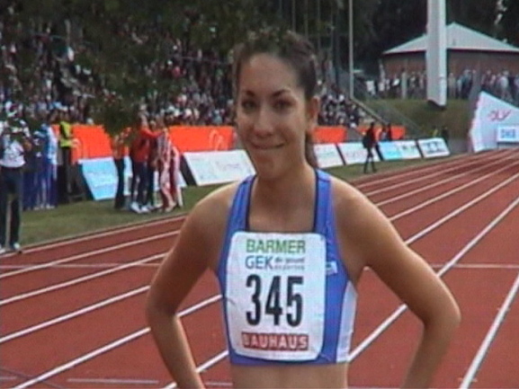 4x400m-Staffel w U 20: Startläuferin Ellise Meyer wird auf der großen Anzeigetafel im Wattenscheider Lohrheidestadion vorgestellt