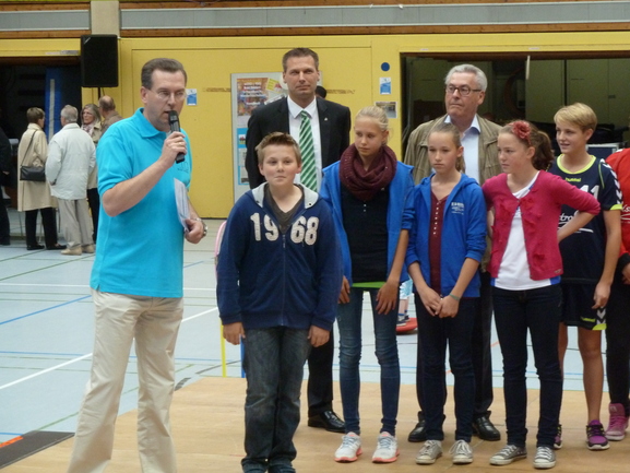 TG Vorsitzender Thomas Braun bei seiner Laudatio für die Preisträger, u.a. die drei LG-Schülerinnen Anna Bauerfeind, Jasmin Schön und Charlotte Hünewaldt