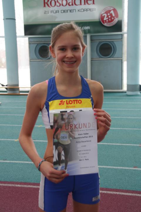 Anna Bauerfeind freut sich über ihren Kreismeistertitel im Hochsprung der W 14 (eine Altersklasse höher als ihre eigentliche Klasse!) mit sehr guten 1,38