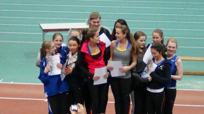 Auch die 4x200m Staffel der w U 18 stand ganz oben auf dem Podest - die Hofherr-Zwillinge vorne und Natascha Seifert und Francisca Guzman-Bausch hinten